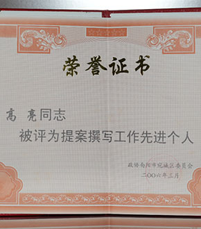 2004年8月榮獲南陽市五一勞動模范獎章