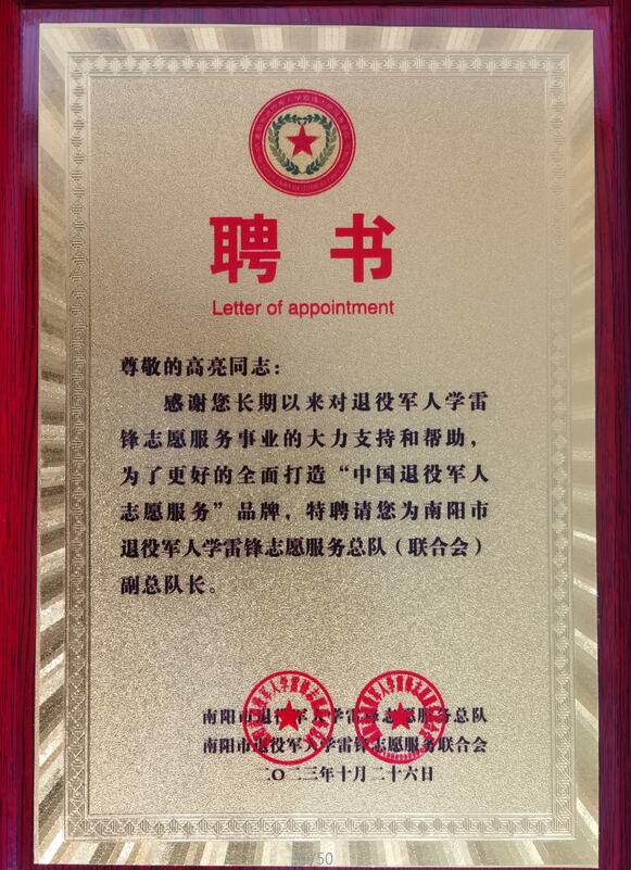 2023年被南陽市退役軍人學雷鋒志愿服務總隊聘請副總隊長